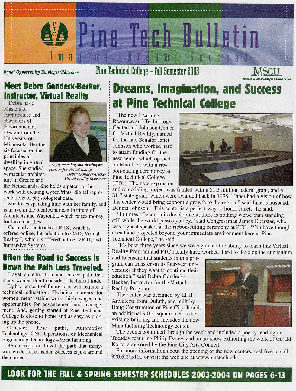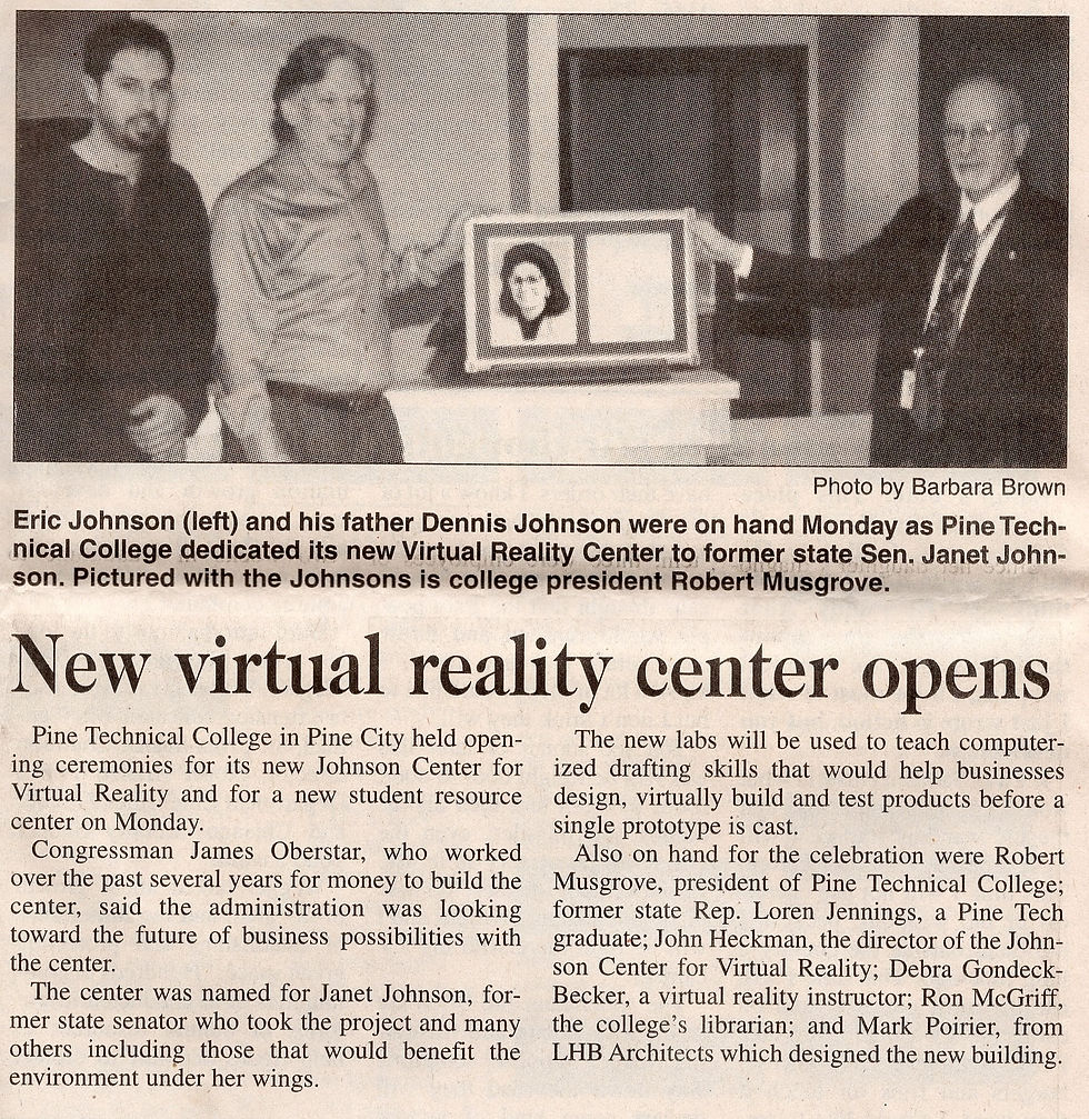 The Johnson Center for Virtual Reality began with President Robert Musgroves vision of Pine Technical College as the foundation of high technology development in the East Central Minnesota region. This virtual concept is becoming a reality now, with over $2,000,000 in projects in progress, including a 3,000 square foot building addition to house the Center. The new addition will include development, laboratory, and display space for high technology initiatives.